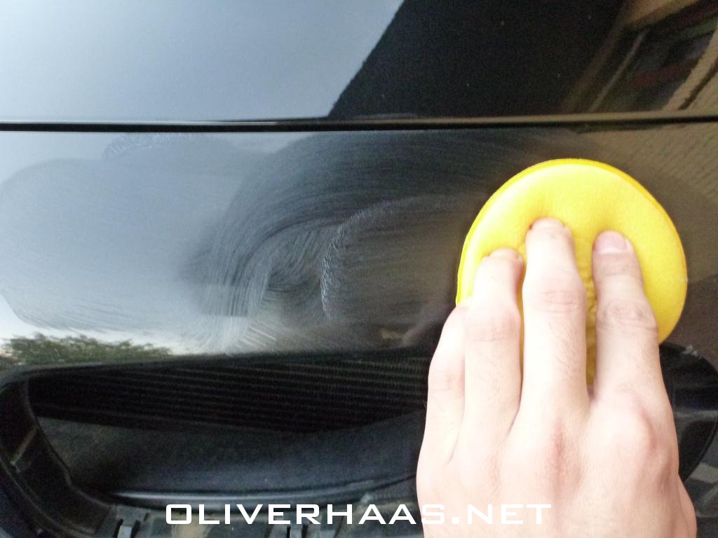 Damit ich auch noch länger etwas von dem schönen Lack habe stand als nächstes die Versiegelung des Lacks an. Dies habe ich mit Meguiar’s Mirror Glaze #16 gemacht. Einfach ein bisschen von dem Wachs auf ein Application Pad auftragen, auf den Wagen auftragen und noch mit einem Microfasertuch abwischen.